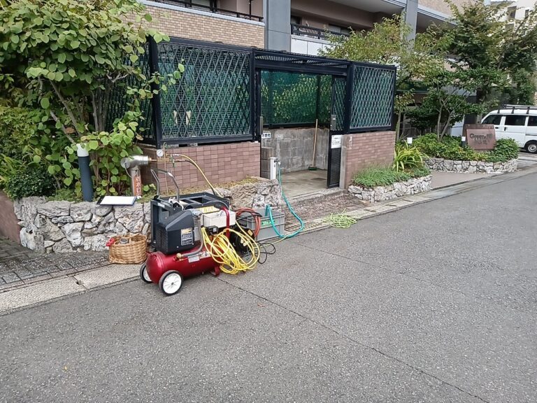 大分県別府市のマンションで連結送水管耐圧試験を実施しましたまず空気圧で配管の破損状況を確認し、その後実際に水圧をかけますまったく漏れがないことを確認し終了しました2025年9月