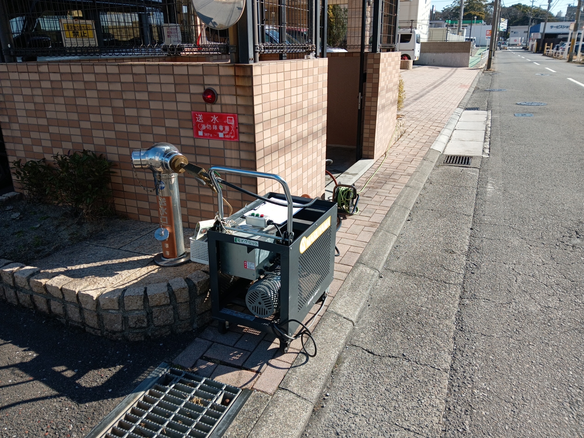 大分市にて、 連結送水管の耐圧試験を実施しました。 連結送水管は、 火災時に消防隊が使用する重要な消防設備です。 建物外部の送水口から水を送り、 建物内の消火活動を支える役割を担っています。 今回の耐圧試験では、 配管に実際に水圧をかけ、 ・漏れがないこと ・所定の水圧に十分耐えられること を一つひとつ確認しました。 この耐圧試験は、 3年に一度実施が必要な点検で、 通常の消防設備点検とは別に費用が発生します。 株式会社イグジットでは、 連結送水管耐圧試験を 1系統 55,000円(税込)にて実施しており、 業界でも最安値水準で対応しています。 火災時に「確実に使える」状態を保つため、 見えない部分こそ、確実な点検が欠かせません。 これからも、実際に圧をかけて確認する 本来あるべき点検を大切にしていきます。