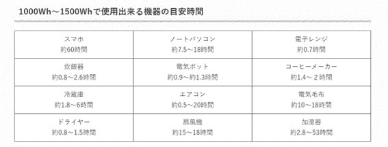 1kWh~1.5kWhの蓄電池で使用できる機器の目安時間蓄電池の値段は何で決まる?